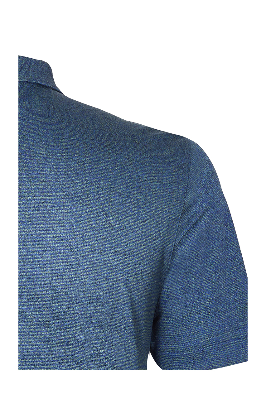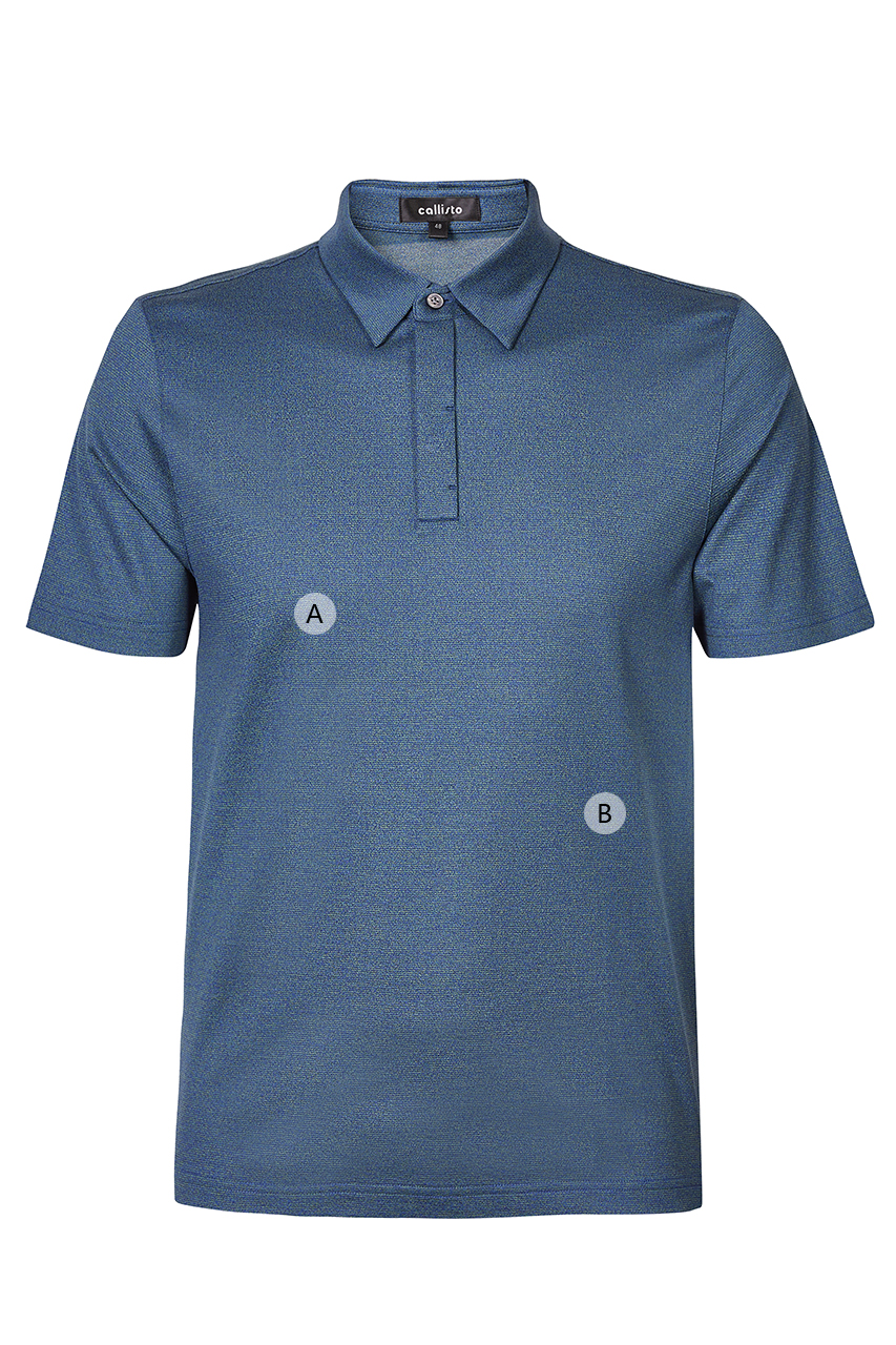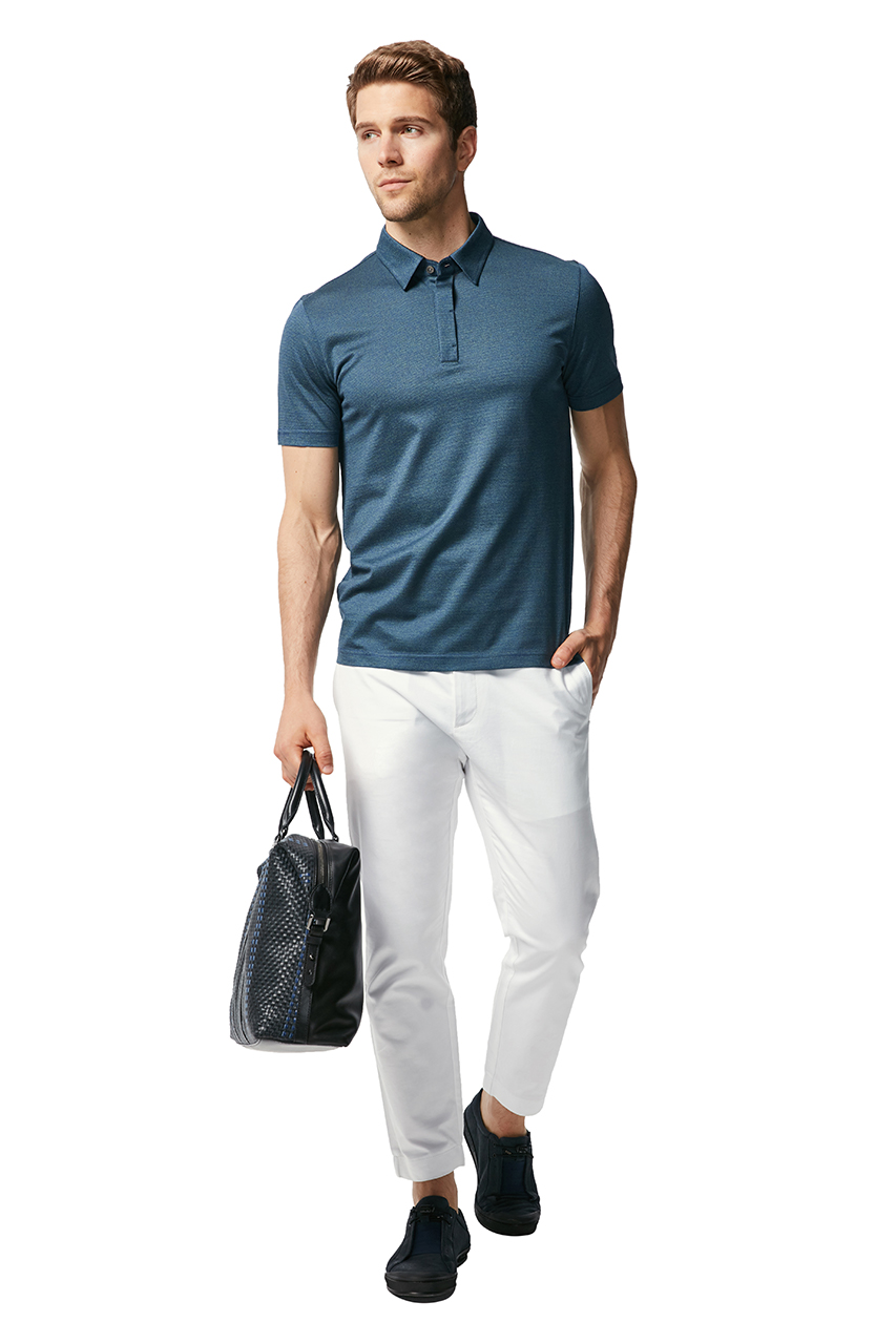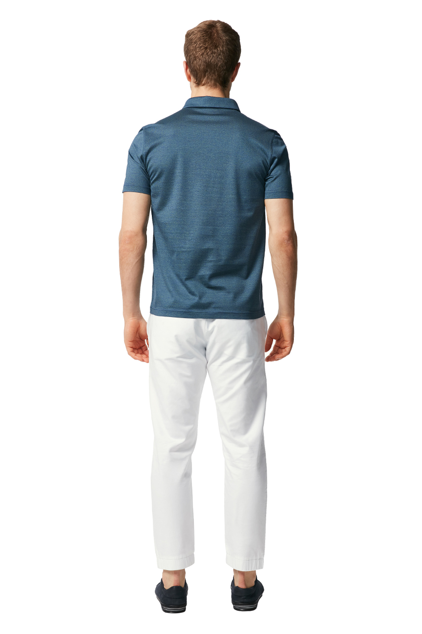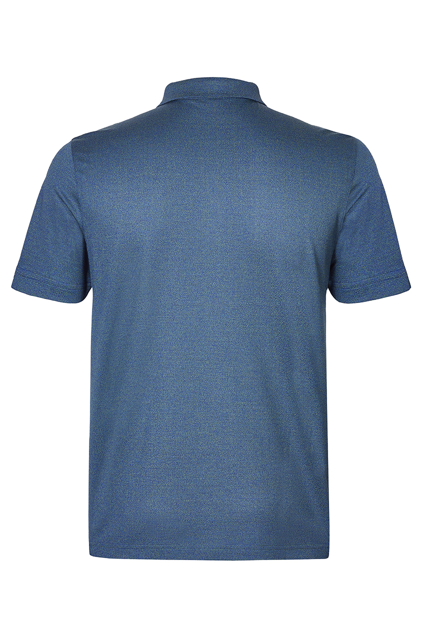 此款深蓝色翻领T恤为丝绵混纺质地,柔软亲肤,光泽细腻,蓝绿色的牙签条纹非常别致